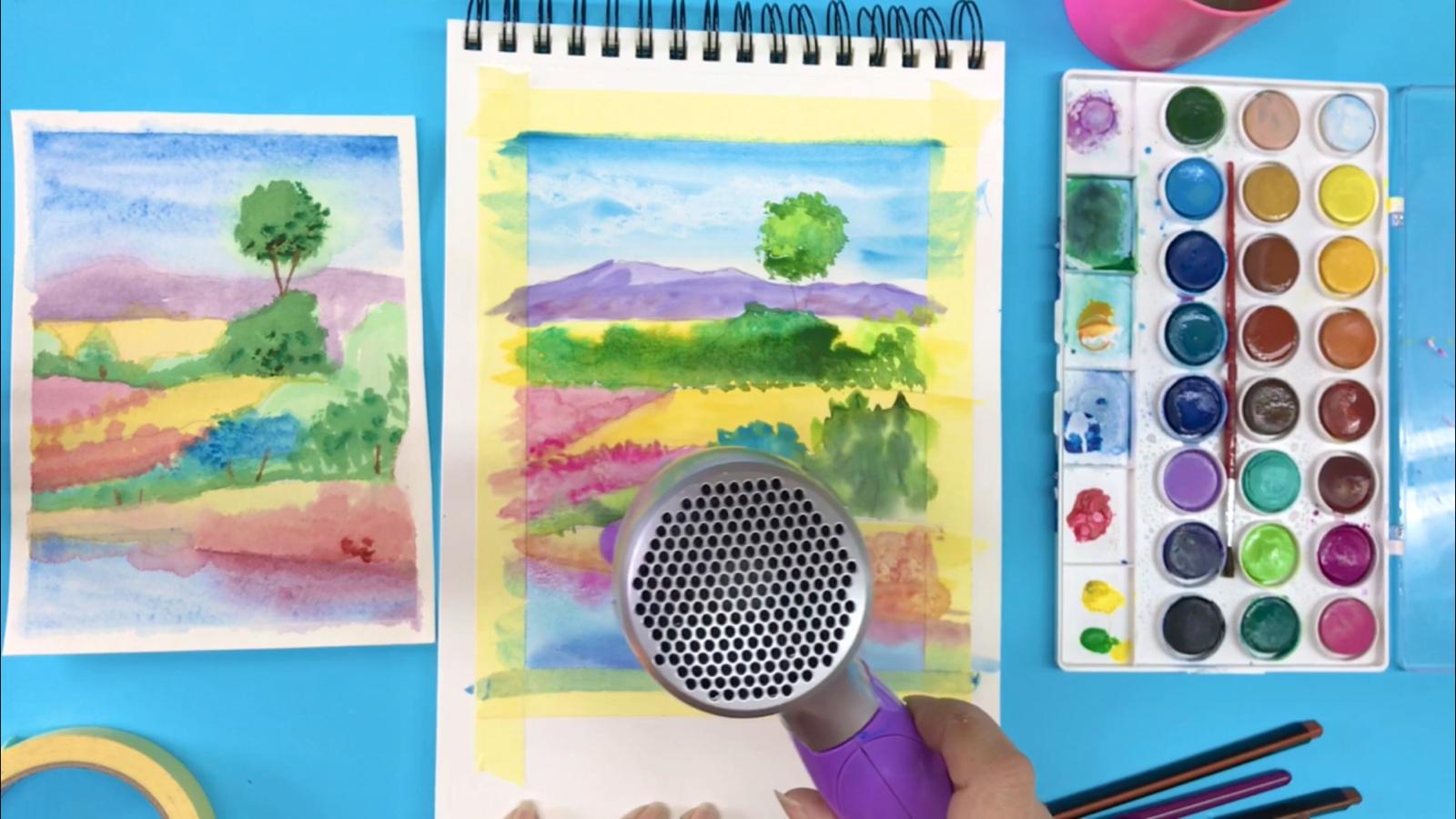 Voy a explicar paso a paso cómo hacer este paisaje de colores. Los peques aprenderán cómo utilizar las acuarelas y a dibujar a mano alzada.